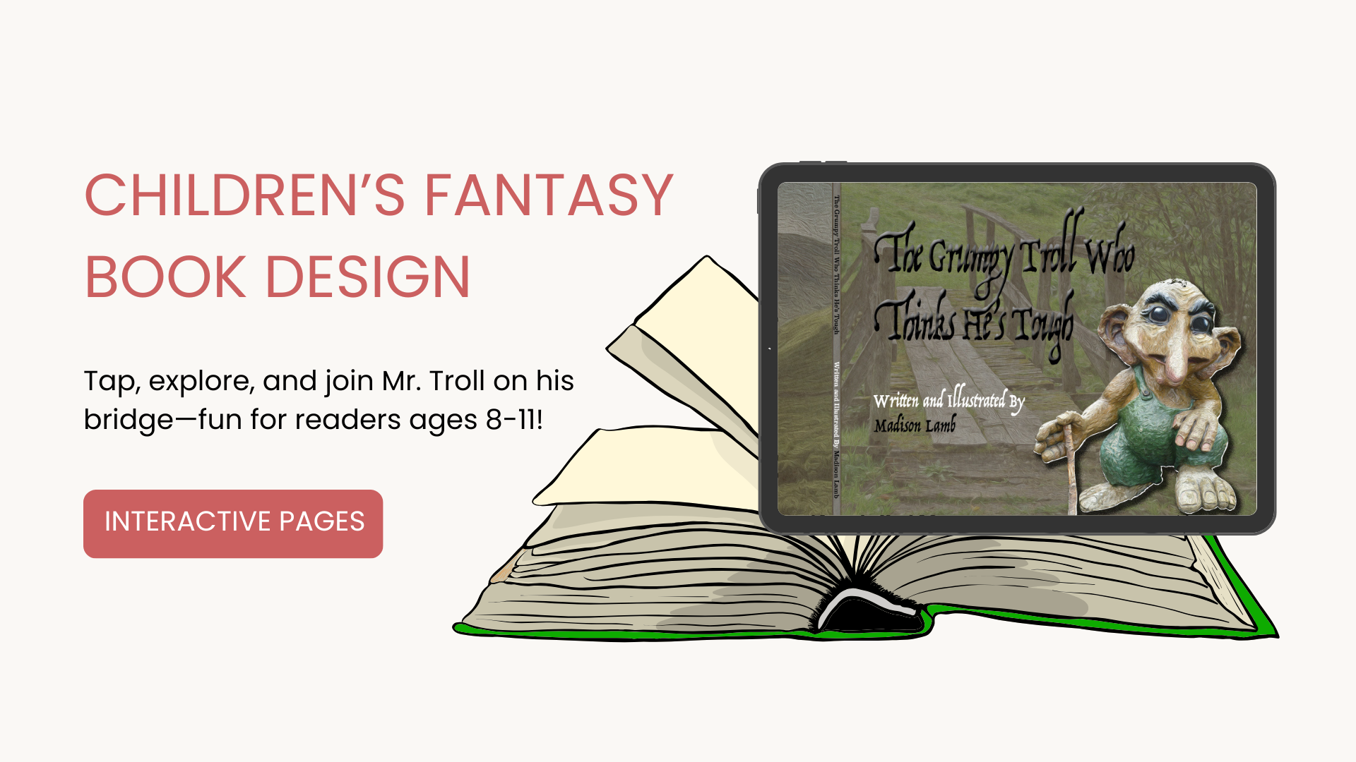 I created a fully interactive, age-appropriate children’s storybook that engages young readers while showcasing playful illustrations and interactive page elements. The Hungry Troll is a 24-page short-form book designed for ages 8–11, featuring tap, swipe, and exploration elements that encourage active reading and discovery. The project involved crafting the narrative, designing the visual layout, and integrating interactive features, resulting in a cohesive and engaging experience that supports literacy development, imaginative play, and interactive storytelling—perfect for parents, educators, and librarians seeking modern, dynamic reading tools.